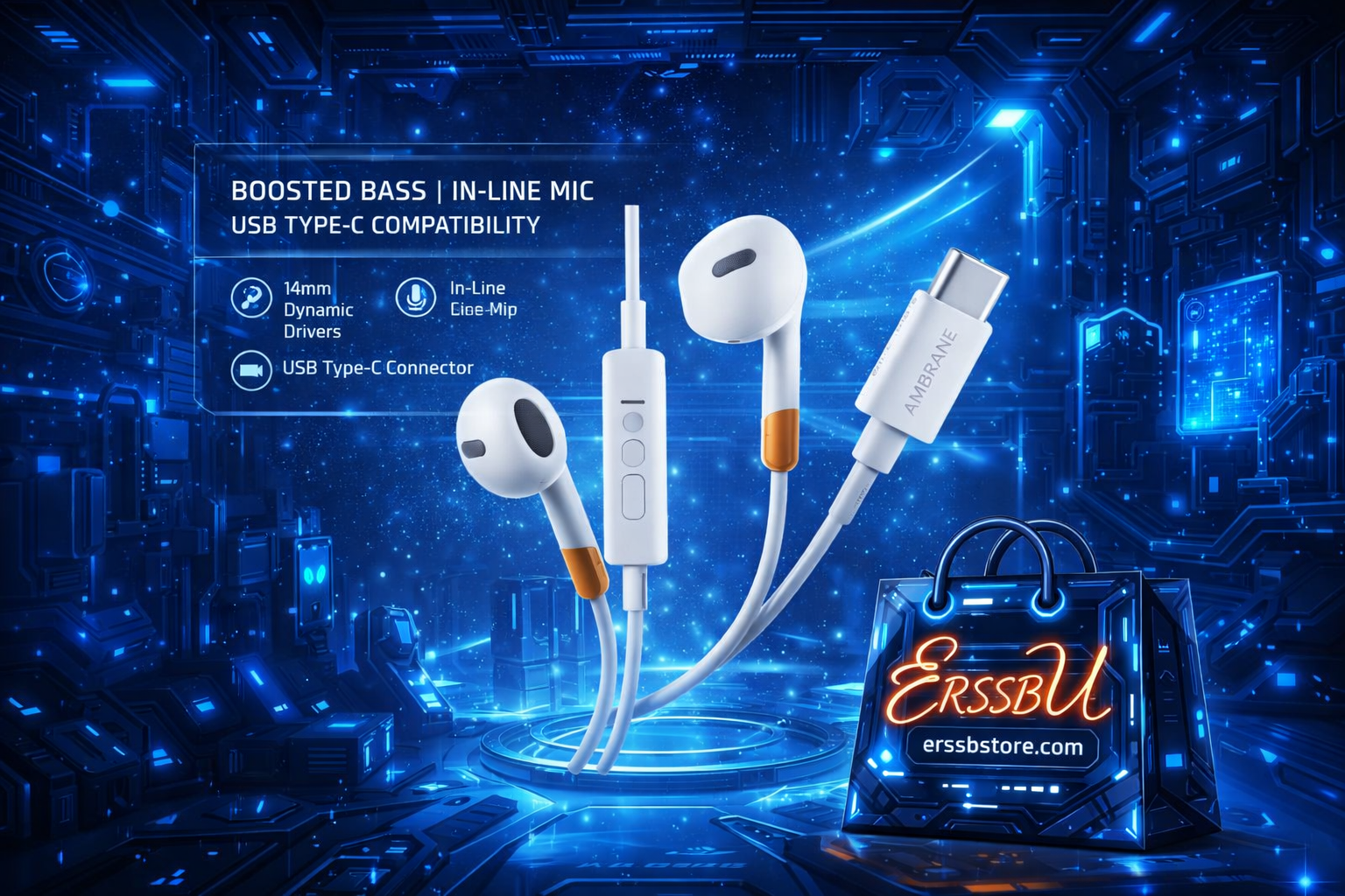 Ambrane Wired USB Type-C Earphones with in-line mic, 14mm dynamic drivers, and boosted bass for clear sound and calling.